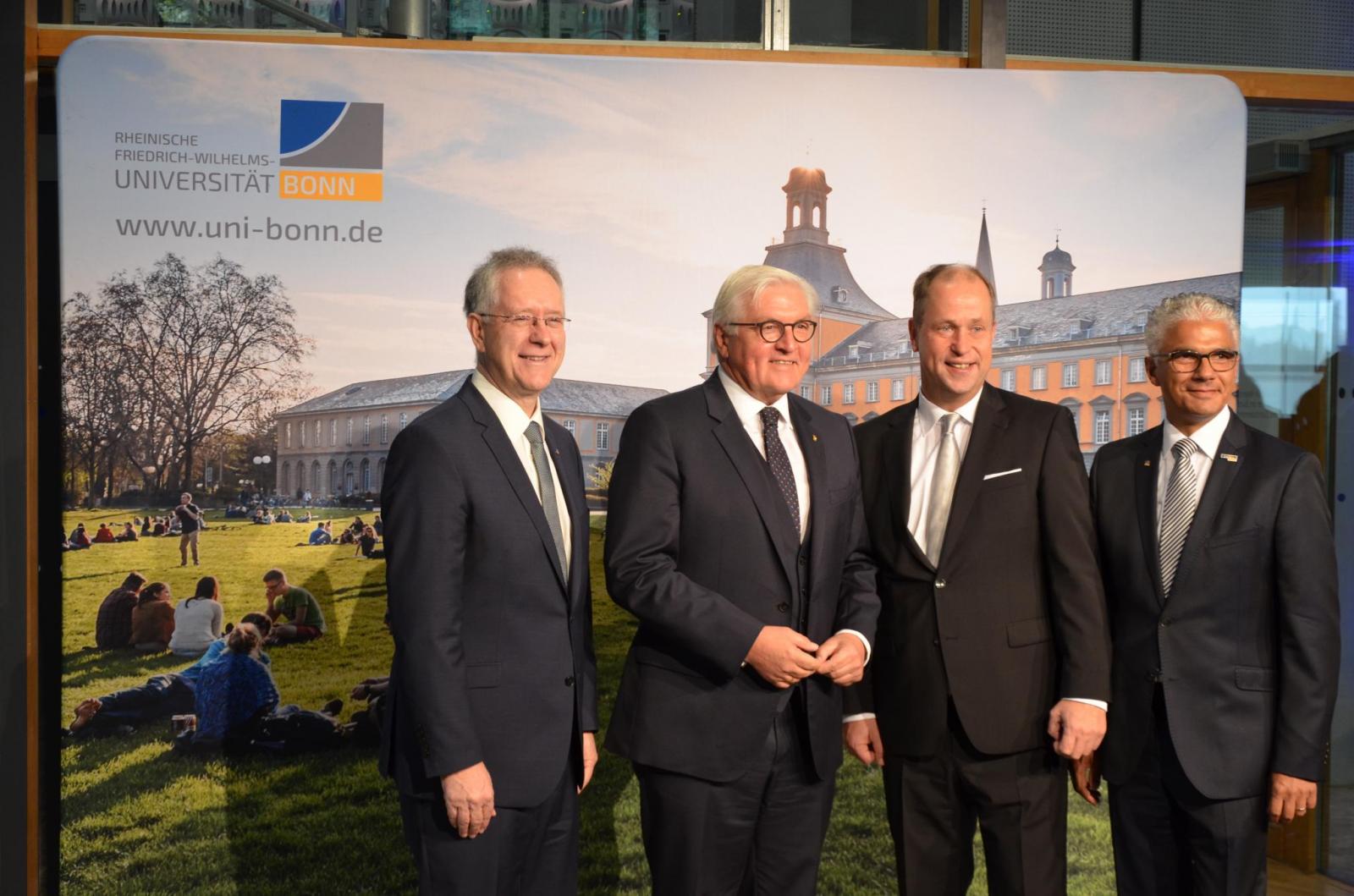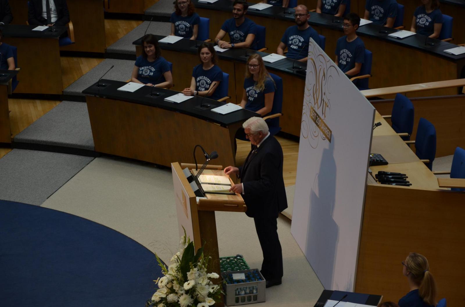 Kritisch beleuchtete der Bundespräsident hingegen die Zeit des Nationalsozialismus, der auch an der Uni Bonn Einzug hielt und in dessen Folge u.a. Thomas Mann seine Ehrendoktorwürde aberkannt wurde. Im Anschluss betont er, dass Universitäten Orte der Diskussionen und dadurch auch der Demokratie seien, „an denen die Freiheitsräume und Schutzrechte […] immer wieder neu ausgelotet werden“. Steinmeier ermutigt zur Erhaltung dieser bewährten Diskussionskultur, ermahnt aber zugleich auch zu einer Auseinandersetzung mit den Entwicklungen des 21. Jahrhunderts, mit denen Forschung und Lehre auf Augenhöhe bleiben müssten. Schließlich hält der Präsident ein Plädoyer für die Freiheit der Wissenschaft, die ein hohes Verfassungsgut sei und konstitutive Bedeutung für die Demokratie habe. Wissenschaftsfreiheit und Demokratie bedingten sich gegenseitig, und beides werde stark durch die deutschen Universitäten beeinflusst: „am meisten […] kann die Universität beitragen zu einer selbstbewussten, aufgeklärten und freiheitlichen Demokratie – weil nur in einer solchen die Freiheit von Wissenschaft und Forschung ihren dauerhaften Platz findet“.