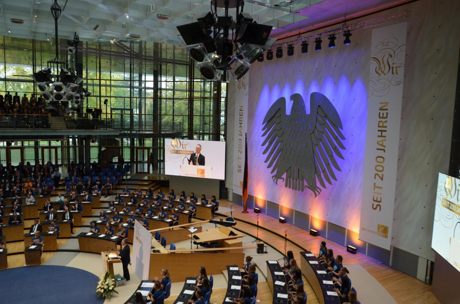 Kühl ist es an diesem Vormittag, am grauen Himmel über Bonn kreist ein Hubschrauber. Im Foyer des ehemaligen Bundestagsgebäudes des Bonner WCCB stoßen Mitarbeiter der Universität aus allen Bereichen, Studierende und viele, auch ausländische, Gäste schon vor dem eigentlichen Festakt auf das Geburtstagskind an, während in der Kreuzkirche mit einem ökumenischen Festgottesdienst der Jubiläumstag begonnen wird. Der Bundespräsident Frank-Walter Steinmeier war hierbei ebenso Ehrengast der Feierlichkeiten wie der stellvertretende NRW-Ministerpräsident Joachim Stamp, Bonns Oberbürgermeister Ashok Sridharan (die beiden letztgenannten übrigens auch Alumni der Uni Bonn) und zahlreiche weitere Ehrengäste.