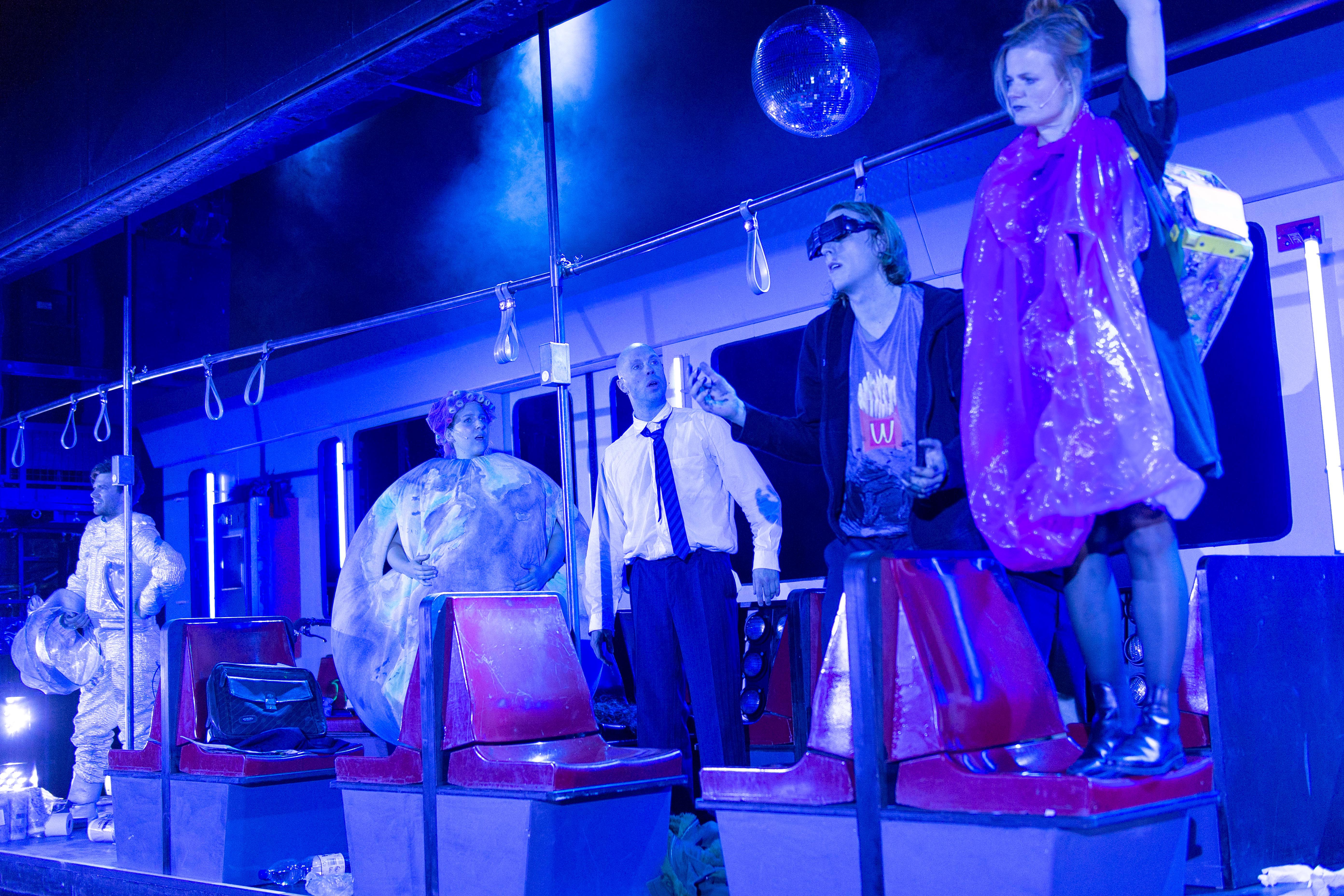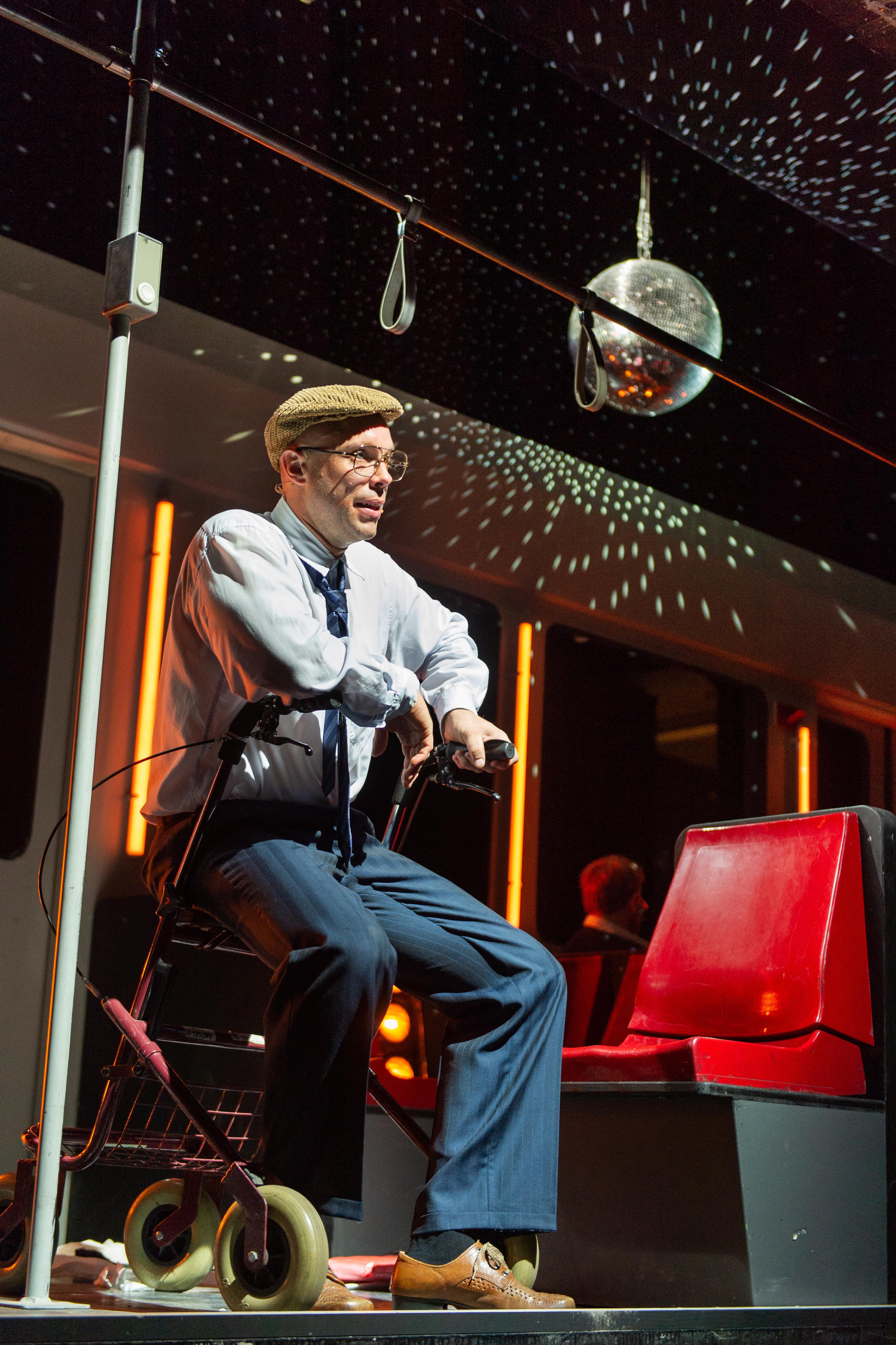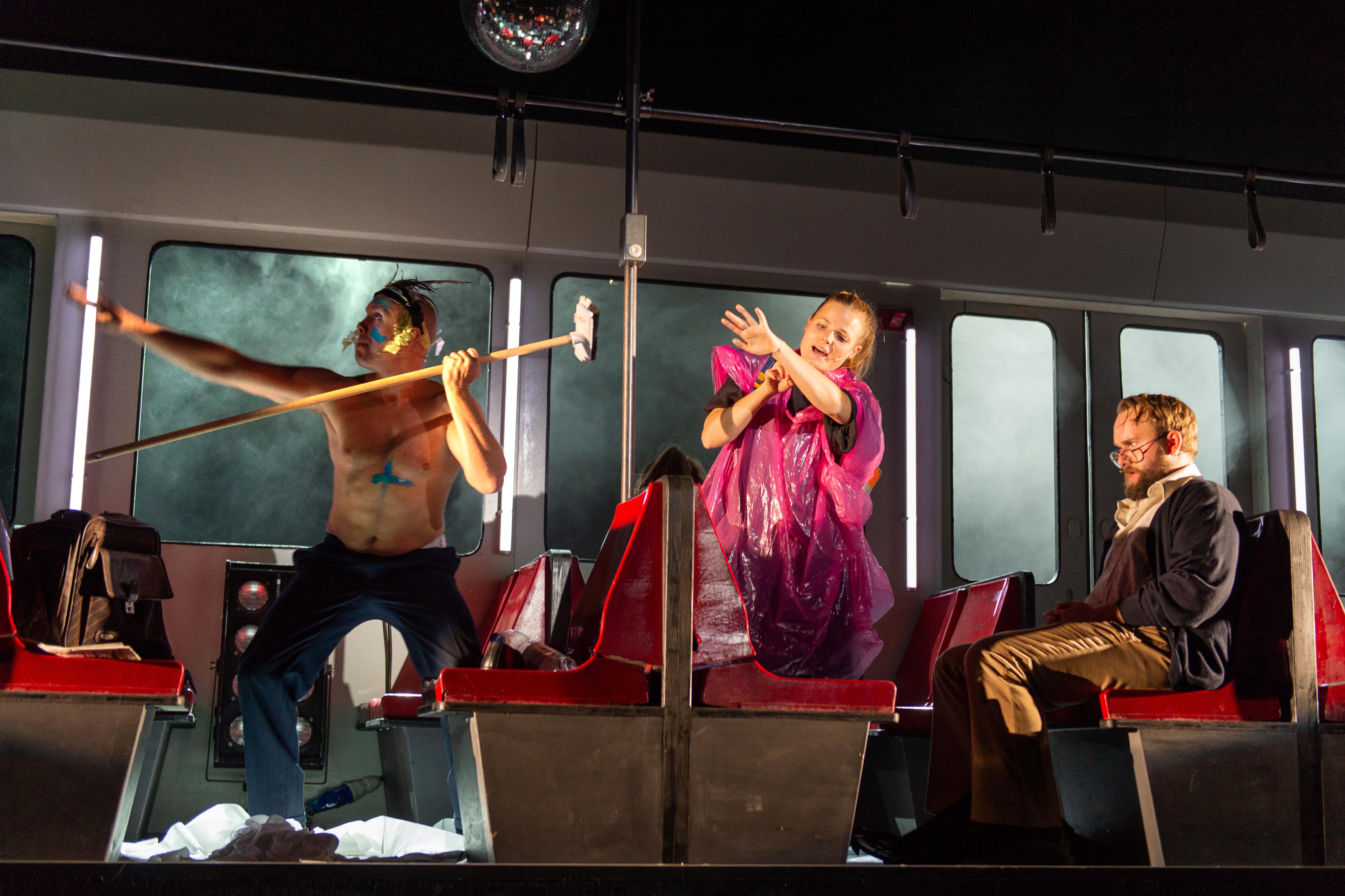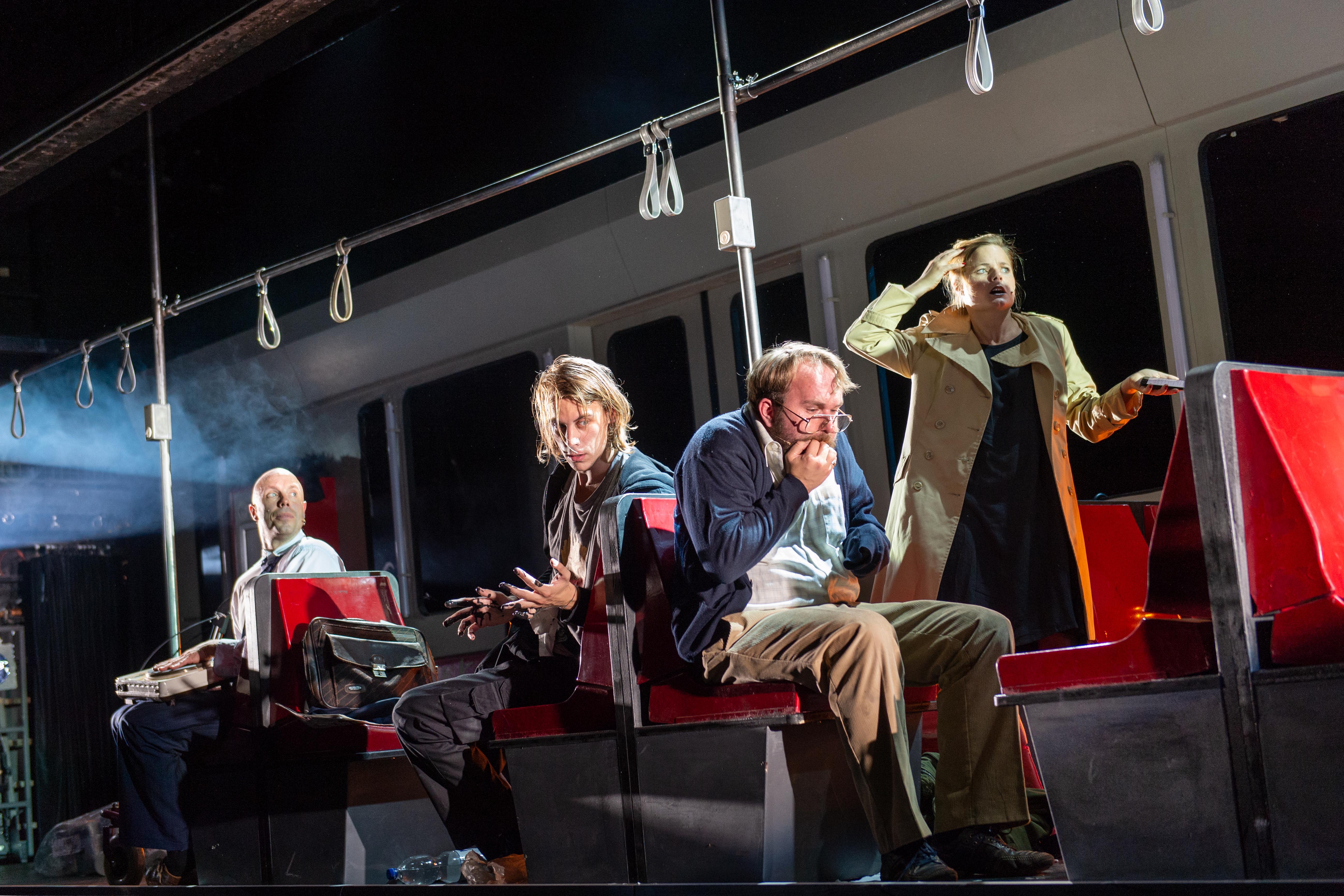 Die Bühne ist originaltreu einem Stadtbahnwagen nachempfunden, sogar an Ticketautomat und Entwerter wurde gedacht. Auch die Figuren könnten einer realen Bahn entstammen, changieren sie doch allesamt sehr überzeugend zwischen Tragik und Komödie. So lernen wir einen Zucker/Fett-Junkie kennen, der ungesundes Essen in sich hineinstopft, obwohl er es doch eigentlich besser weiß. Oder einen Mann, der immer eine Familienpackung Toilettenpapier in der Bahn dabei hat, seit er einmal wegen eines akuten Darm-Notfalls in Widdig (musikalisch untermalt mit dem Lied vom Tod) aussteigen musste und darüber beinahe seinen Verstand verloren hat. Dann ist da die junge Mutter, die von ihrem Kind nur angespuckt und ausgelacht wird, sich von ihm gestalkt fühlt – und damit einen Diebstahl im Supermarkt begründet. Wir treffen einen Mann mit einem schwarzen Balken vor den Augen, der für jedes entsprechende Foto gebucht wird und regelmäßig in Bild, Gala, Bunte zu sehen ist. Ihm gegenüber sitzt der Aluhutträger, der vor bösen Strahlen und der Macht des Mammon warnt („Ihr wartet doch nur darauf, euch im Elektromarkt das neue GoogleMacAlexaBluetoothUltraHD8KGesichtserkennungsKaffeekapselTablet kaufen zu können“) und sich am Ende doch nur als schnöder Bettler entpuppt. Der Überlebenskünstler Robinson Jugo vom Balkan jagt währenddessen Enten aus den Rheinauen, sammelt Bärlauch im Kottenforst und Pilze im Botanischen Garten.
