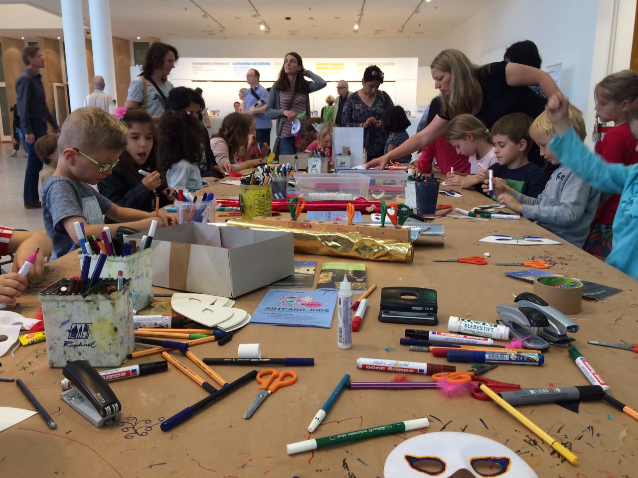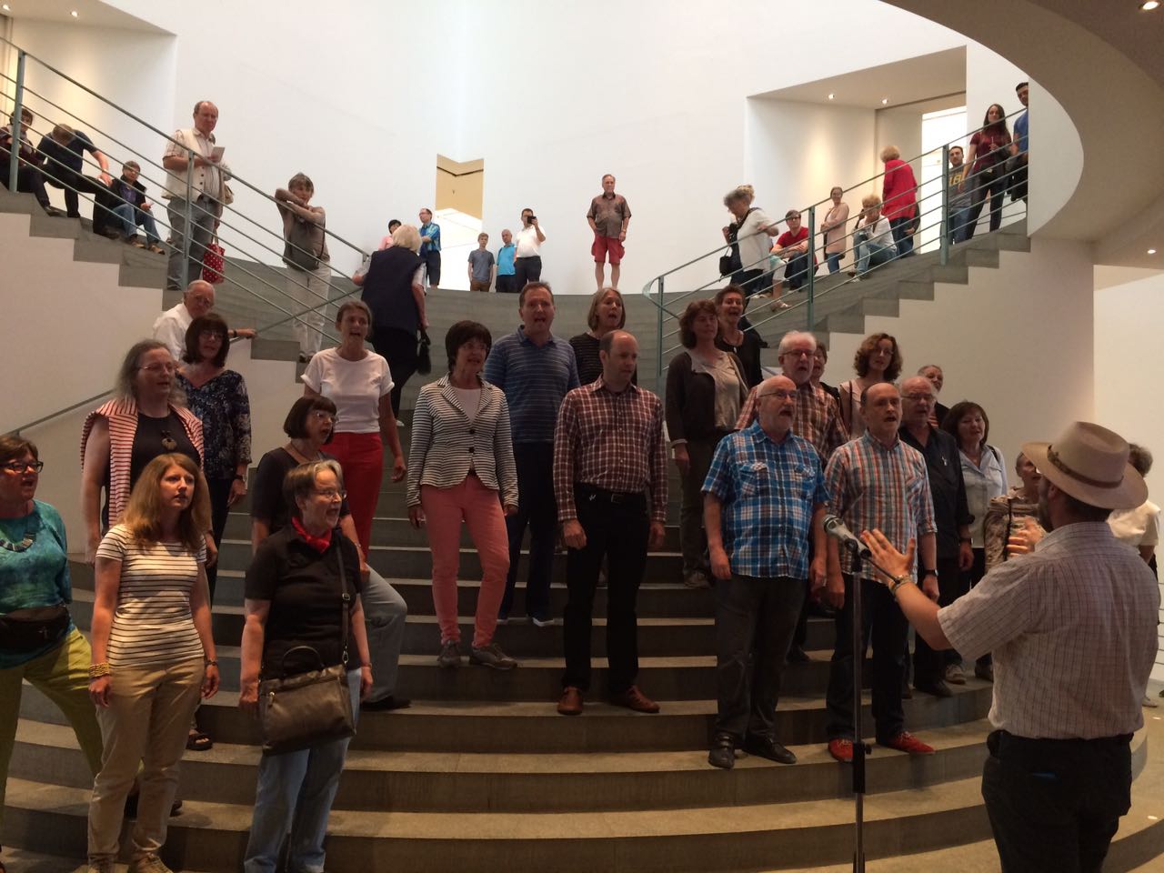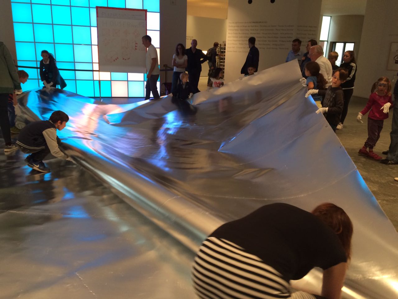 Als letztes geht’s ins Kunstmuseum. Und zwar gerade rechtzeitig, um den Chor-Flashmob zu Ehren des 25-jährigen Bestehens des Museums an der Museumsmeile zu sehen und zu hören. Anschließend hält Intendant Prof. Dr. Stephan Berg eine kurze Dankesrede, während der bereits viele Besucherblicke sehnsüchtig zu dem Tisch wandern, auf dem seine Kollegen ihre selbstgebackenen Kuchen aufstellen. Riccarda Hessling vom Kunstmuseum erzählt mir im Anschluss, dass fast jeder Mitarbeiter einen Kuchen beigesteuert hat. „Sie sind zwar nicht extra professionell gemacht, aber wir fanden das eine herzlichere und persönlichere Art, unseren Geburtstag mit den Besuchern zu feiern.“ Langsam wird es ganz schön voll hier im Foyer, nicht nur durch die vielen Gäste, sondern auch durch das riesige Origami-Papierschiff, das mitten im Raum steht. „Der Künstler Frank Bölter faltet hier den ganzen Nachmittag zusammen mit den Besuchern große Objekte“, meint Riccarda Hessling. Das Schiff könne sogar auf dem Rhein schwimmen. Warum das funktioniert, könnten mir sicher die Kinder im Deutschen Museum ganz genau erklären.