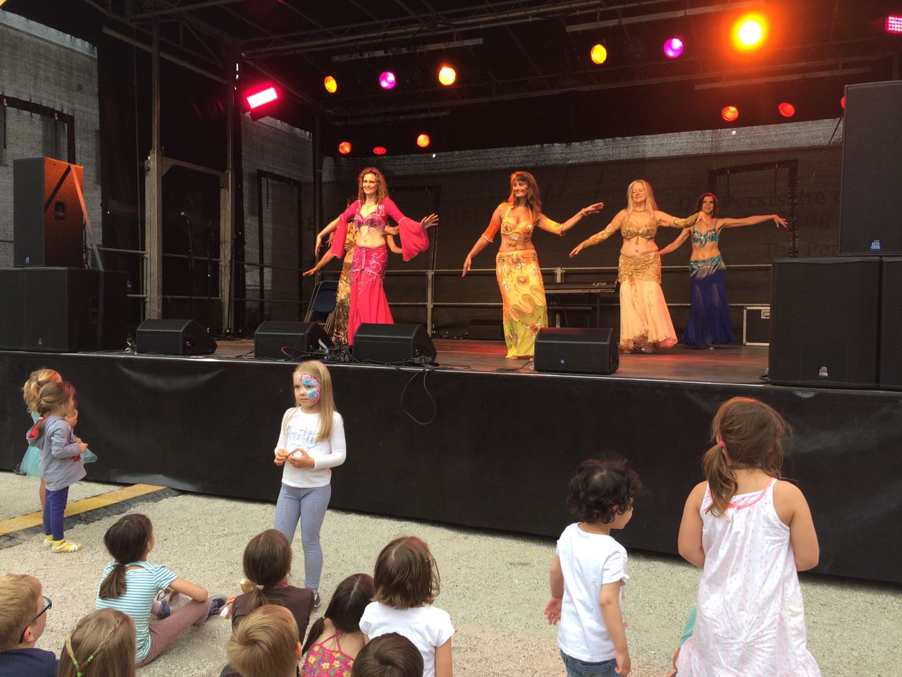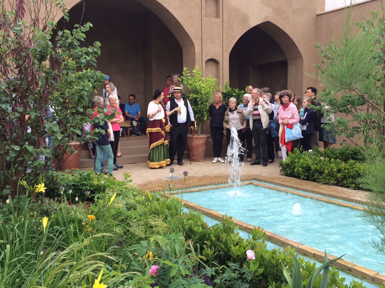 Die Bundeskunsthalle hat ihr Programm in diesem Jahr auf ihre Ausstellung „Iran. Frühe Kulturen zwischen Wasser und Wüste“ abgestimmt. Ich schaue auf dem Vorplatz dem Auftritt einer Bauchtänzerinnen-Gruppe zu und gehe dann hinüber in den Persischen Garten. Trotz der vielen Besucher herrscht hier eine entspannende Atmosphäre mit dem Wasserbecken in der Mitte und den kleinen Nischen am Rand des Gartens, in denen man sich in passend dekorierte Sitzecken setzen kann. Ich habe das Gefühl, dass sich hier manch einer vom Kindertrubel, der draußen herrscht, erholen will.