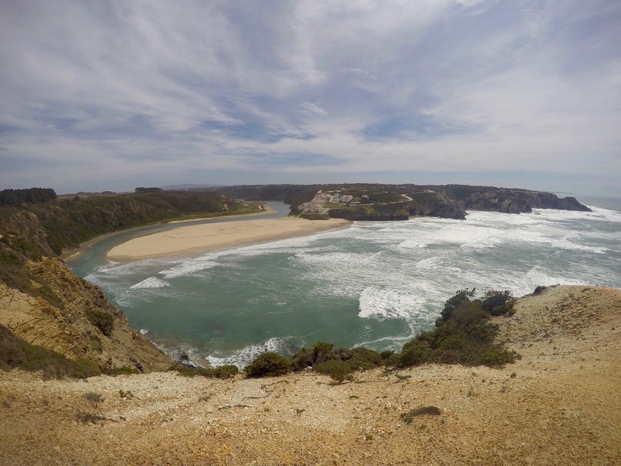 Entlang einzelner Klippenanwesen wohlhabender Portugiesen geht es bei starkem Wind weiter. Einsame, nur vom Wasser aus erreichbare Strände, an denen wir sehr selten Angler beobachten, kleine Wasserfälle oder große Flussmündungen, in denen das Meer bei Flut das Süßwasser zurücktreibt. Der Wanderweg führt uns wenige Kilometer ins Land in eine kleine Stadt mit meist weißen Häusern, die in den Berg gebaut sind. Oben im Dorf dreht sich eine alte Windmühle und das grüne Panorama erinnert an vieles in Europa, aber nicht an Portugal.
