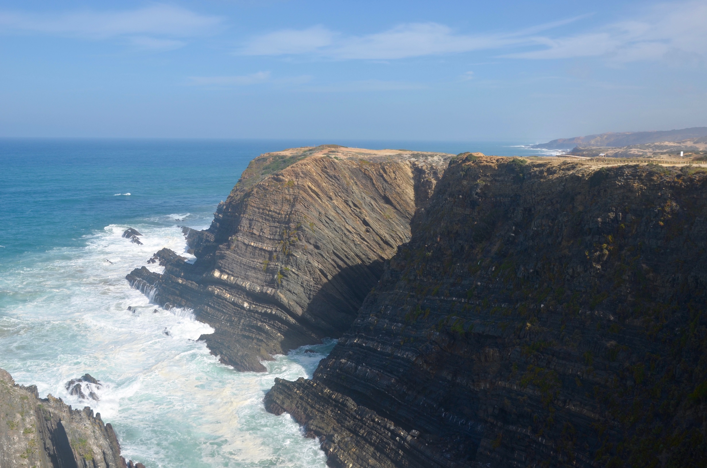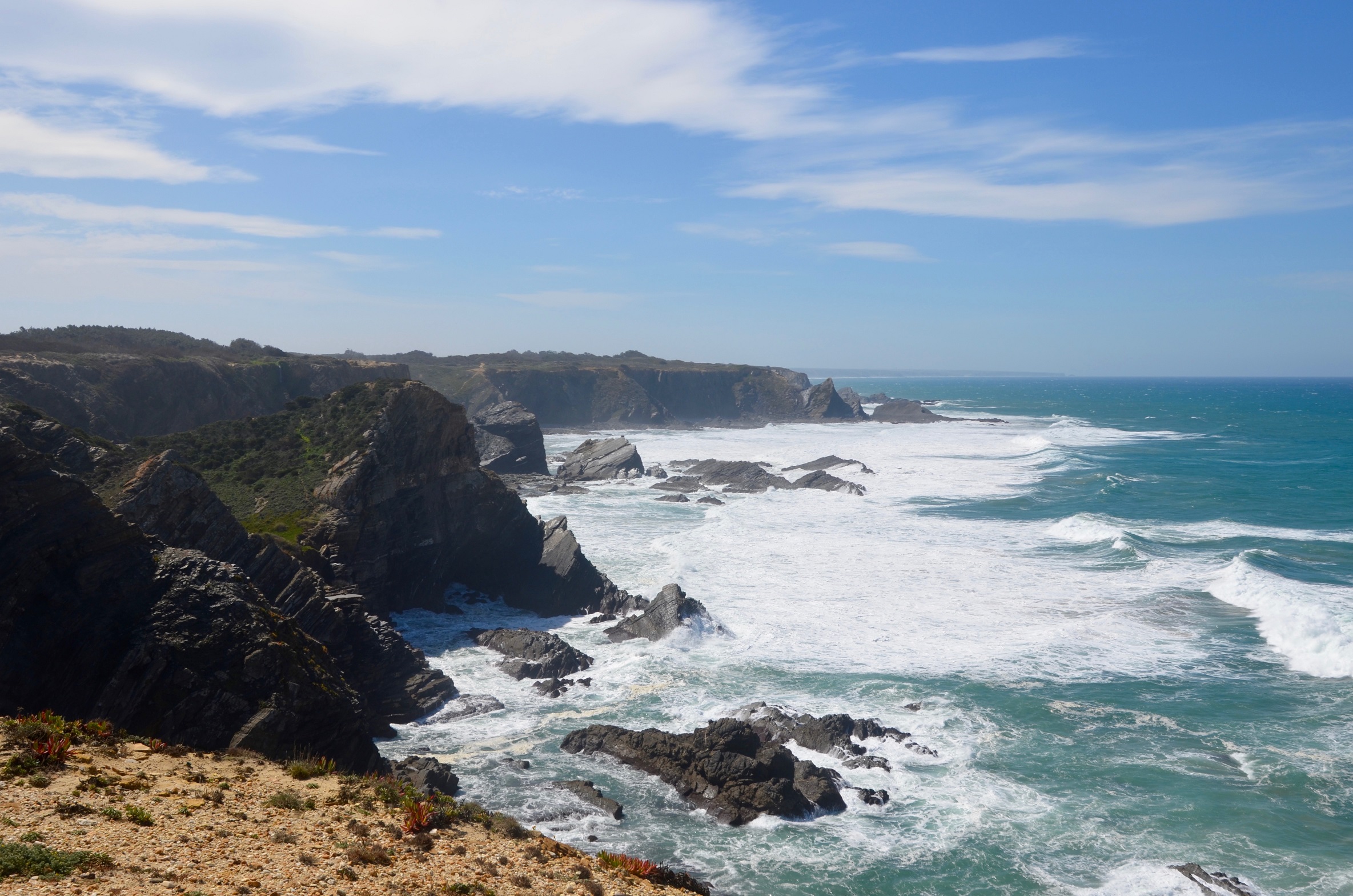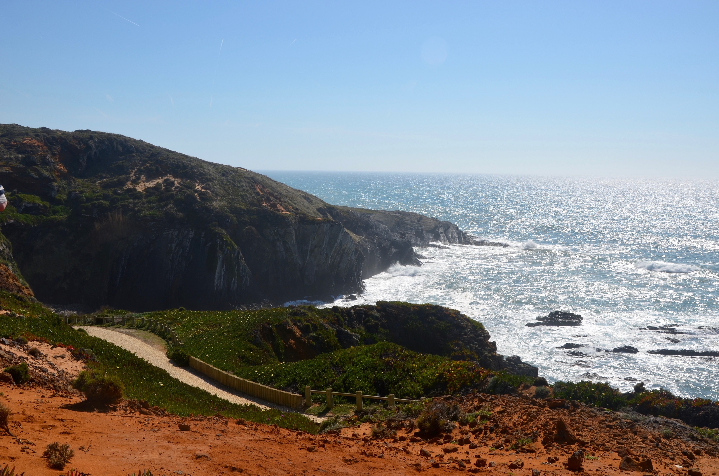 Am nächsten Tag sehen wir Storchennester auf den Steilklippen. Weiterwandern mit Blick auf den Atlantik, die Gefühle von Vasco da Gama nachempfindend. Mittags gibt es ein Stimmungstief, die Sonne knallt auf unsere Köpfe. Ich habe den großen Fehler begangen, keine Sonnenbrille dabei zu haben. Ich kann mir lebhaft vorstellen, wie die Landschaften Portugals im Sommer so verdorrt aussehen können. Wir warten, bis die Sonne untergeht und wir uns an die Bank direkt auf den Klippen setzen können.